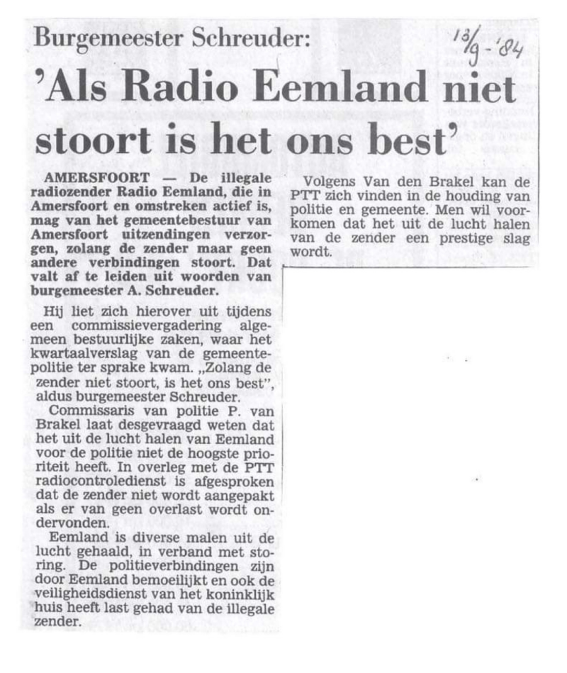 Maar zoals het gezegde gaat, alle goede dingen komen ten einde. Eind jaren tachtig kon de Amersfoortse burgemeester niet langer de ogen sluiten voor de ondeugende golven van Radio Eemland. Handhaving werd onvermijdelijk, en niet alleen piratenzenders werden beboet. Zelfs adverteerders werden aangemaand alsof ze plotseling lid waren geworden van een criminele organisatie. Het piratenlandschap kwam op deze manier eind jaren tachtig landelijk tot een abrupt einde.